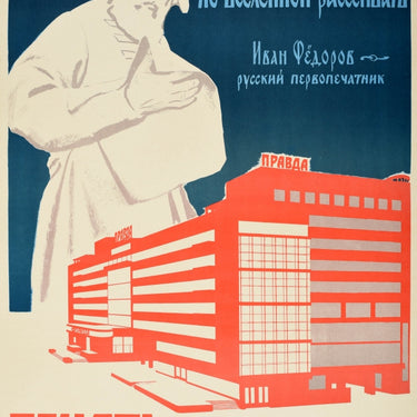 Original vintage Soviet propaganda poster - Print is a powerful tool of human culture! / Печать Могучее орудие человеческой культуры! Great design depicting the Leningradskaya Pravda / Truth (founded 1912) newspaper building in Moscow with an image of the first known Russian printer Ivan Fyodorov (c.1525-1583), known as one of the fathers of Eastern Slavonic printing, against the blue background next to a quote by him - Sowing spiritual seeds throughout the universe - in traditional old style lettering. Very good condition, small restored tear on left margin, backed on linen.