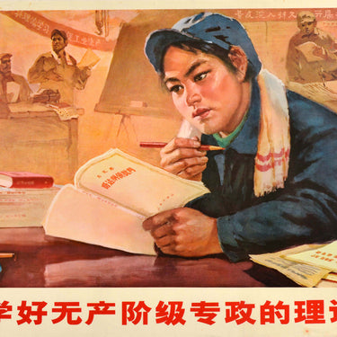 Original vintage Chinese propaganda poster - Learn the theory of proletarian dictatorship well / 学好无产阶级专政的理论 - featuring an illustration of a lady studying the Critique of the Gotha Programme by Karl Marx with other works by Mao Zedong, Marx, Lenin and Engels on her desk and images of people writing, teaching and learning in the background. Horizontal. Good condition, creasing, tears, staining.