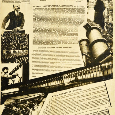 Original vintage Soviet propaganda poster - It takes over the masses Dictatorship of the proletariat - depicting a black and white photomontage design including photographs of Vladimir Lenin and Joseph Stalin, industrial factory workers, a Communist meeting, cattle farmers in an agricultural livestock shed, and an electro station dam on a river with articles featuring quotes by Lenin on socialism and by Karl Marx on the struggle for socialism, the first stage of communist society, Stalin on the Soviet economic system, the results of the first five year plan and the struggle for a classless society in the second five year plan. Fair condition, several restored crease marks on image, several restored tears, staining, restored paper losses, gloss finish, backed on linen.