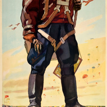 Original vintage Soviet propaganda poster - Glory to the Winged Heroes! / Слава Крылатым Богатырям! Dynamic artwork by Igor Aleksandrovich Kominarets (b 1923) depicting a pilot in uniform standing in front of fighter jets and other planes flying overhead, and parachutes in different colours in the sky and on the field with flags on the side by the spectators and the text in the style of a plaque surrounded by laurel leaves with a Soviet star emblem below. Large size. Acceptable condition, restored paper loss in bottom left corner, large restored tears, restored paper skimming on image, staining, backed on linen.