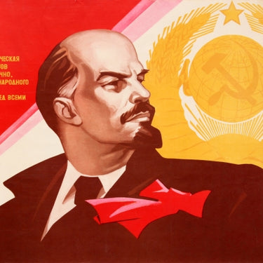 Original vintage Soviet propaganda poster featuring an image of Lenin wearing a red ribbon on his suit with a war ship and the text against a red background on the left and, on the right, a golden yellow Soviet emblem with the hammer and sickle over a globe of the world inside two wheat sheaves with a star above. Horizontal. Very good condition, creases, minor tears on top margin.