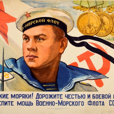 Original vintage Soviet propaganda poster - Soviet Sailors! Cherish Honour and Military Glory, Strengthen the Power of the USSR Navy! - featuring a sailor in uniform in front of a Soviet Navy flag with medals and warships in the background, the bold blue text below. Horizontal. Good condition, restored tears, restored paper losses, trimmed edge, backed on linen.