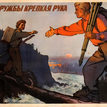Original vintage Soviet propaganda poster - Friendship has a strong hand - featuring a great image of a young man reaching out to help a young lady to cross a tree trunk bridge lying over a fast flowing river between two hills with more people wearing hiking clothes and holding equipment and sticks walking towards them along the path, the forest leading to the sunset on the horizon and the text against the sky above. Horizontal. Fair condition, stains, cracks, folds, repaired tears in top left corner.