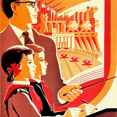 Original vintage Soviet propaganda poster - Glory to the Soviet Teacher! - featuring a school teacher wearing a suit and glasses and holding a pointer next to a young boy and girl who are both wearing smart uniforms with red Pioneer neck scarves and sitting up straight at their desks with an image of a farm and trees with a dam and industrial factories in front of building construction cranes and a stylised shining sun in the background, the bold red title text below. Good condition, tears, creasing, pinhole at the top left.