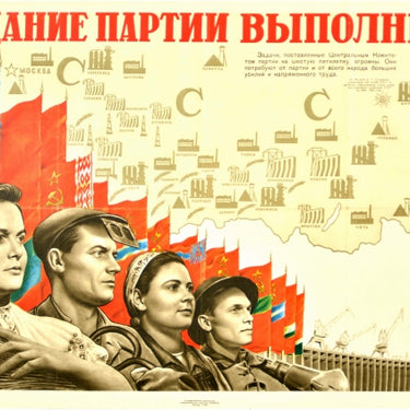 Original vintage propaganda poster - We will fulfil the Party plans! - featuring four Soviet workers including a farmer wearing a scarf and holding wheat in the foreground, an industrial metal welder and a miner holding equipment over his shoulder in front of the colourful flags of the 15 Soviet republics and a map of the CCCP / USSR showing the various factories and power plants in the different cities and regions including Moscow marked with a star, Irkutsk and Vladivostok below the bold text in red lettering with cranes and construction on the side. Horizontal. Very good condition, folds, minor tear.