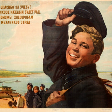 Original vintage Soviet propaganda poster featuring an image of a smiling young man doffing his cap towards the viewer on the way to joining others making their way to a boat with pylons and factories in the fields on the sides of the river and a tug boat pulling a cargo load on the water, the text above reading: Thank you for the education from the bottom of our hearts, we will now go and help the farming peasants. Horizontal. Fair condition, restored paper loss, creases, tears and folds, backed on linen.