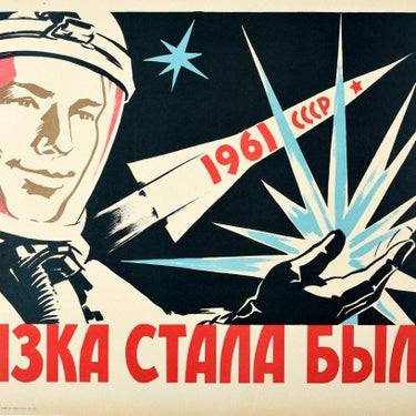 [ON RESERVE 12/08/2025] Original vintage Soviet propaganda poster - скаска стала былью / The Fairy Tale Came True 12 April 1961 - featuring dynamic artwork against a black space background of Yuri Gagarin (Yuri Alekseyevich Gagarin; 1934-1968), the Soviet pilot and cosmonaut who was the first man in space on 12 April 1961, holding a spark in front of a blue star and a white rocket with the text in red 1961 CCCP / USSR and a red star on it, the rest of the bold stylised lettering on the side and below. Horizontal. Good condition, repaired tears, browning, backed on linen.