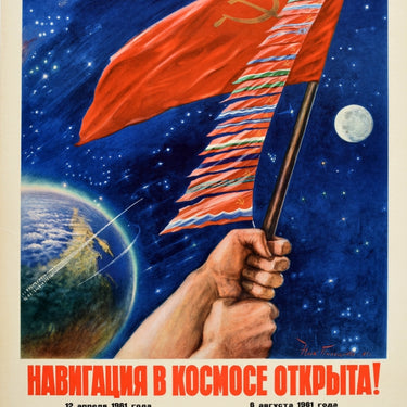 Original vintage Soviet space propaganda poster - Navigation In Open Space! / Навигация В Космосе Открыа! - featuring a spacecraft in orbit around planet earth with the hands of a man holding a red USSR flag with a hammer and sickle emblem on it and flags of the Soviet countries along the pole in the centre, the moon on the other side of the starry blue background with the title in bold red text below, and information in black on Yuri Gagarin (Yuri Alekseyevich Gagarin; 1934-1968), the Soviet pilot and cosmonaut who was the first man in space on 12 April 1961, and the second person in space, Gherman Titov (1935-2000), on 6 August 1961. Very good condition, repaired tears, browning, backed on linen.
