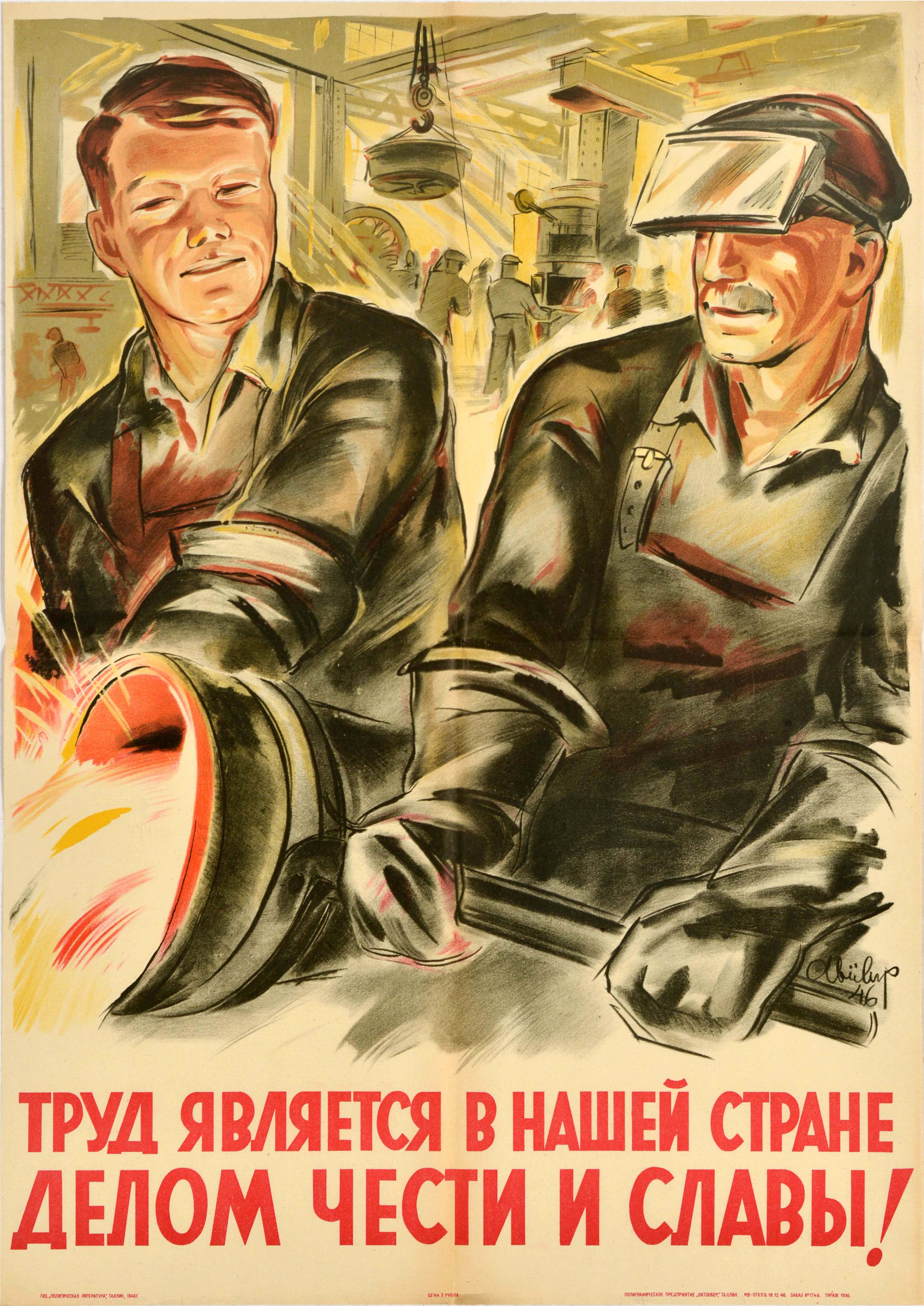 Original vintage Soviet propaganda poster - Labour is a matter of honour and glory in our country! / Труд является в нашей стране делом чести и славы! - featuring an image of two male industrial workers labouring in a metal factory, depicted with strong, confident expressions and postures, one of the men wears a welding mask pushed up on his head, while the other is working with molten metal. Published by Politicheskaya Literatura, Tallinn. Printed by Oktoober Printing Company. Good condition, folds, creasing, tears, staining.
