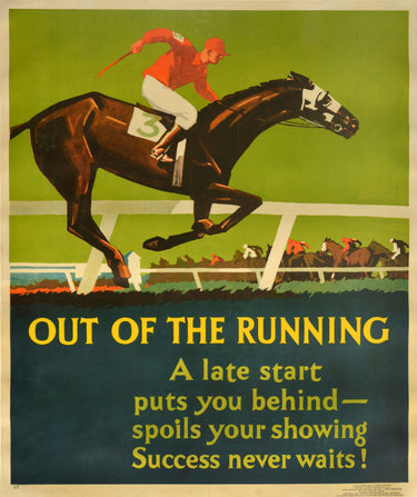 Original vintage workplace motivational poster - Out of the running. A late start puts you behind - spoils your showing. Success never waits! - featuring a dynamic image of a jockey on a horse galloping to catch up with the others in the race. Copyrighted 1929, Mather & Company, Chicago, Illinois. Printed in the USA. Good condition, restored tears, staining, restored paper losses, restored pinholes, backed on linen.