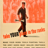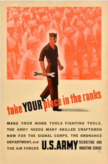 Original vintage military recruitment poster - Take YOUR place in the ranks. Make your work tools fighting tools. The army needs many skilled craftsmen now for the Signal Corps, the Ordnance Department, and the Air Forces. U.S. Army Recruiting and Induction Service. - featuring an image of a soldier in uniform holding a wrench set over a photograph of marching soldiers. Good condition, creasing, tears, pinholes, staining, paper losses, paper skimming.
