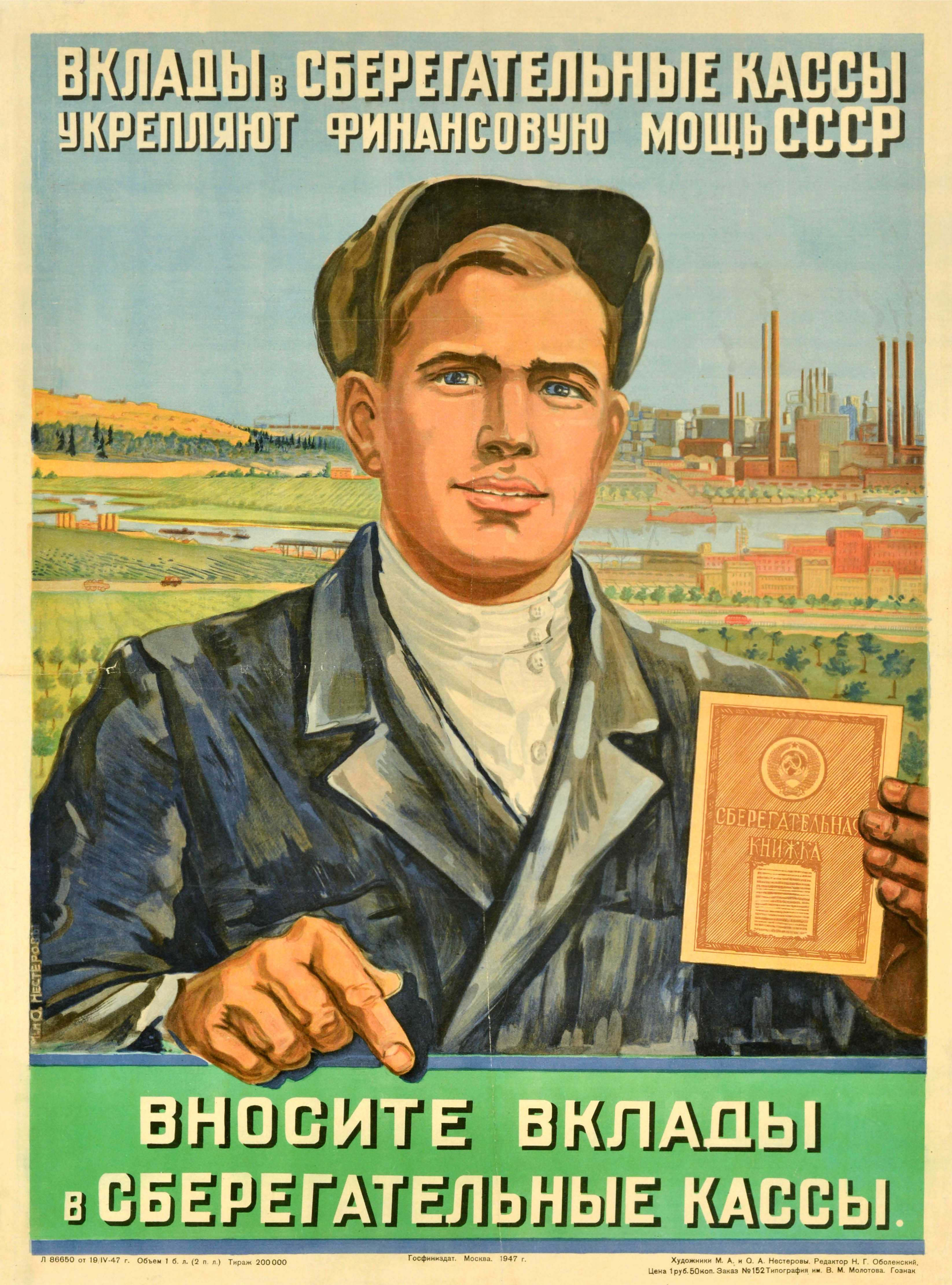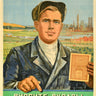 Original vintage Soviet propaganda poster - Savings bank deposits strengthen the financial strength of the USSR Make savings bank deposits / Вклады в сберегательные кассы укрепляют финансовою мощь СССР Вносите вклады в сберегательные кассы - featuring an earnest young man wearing a cap and holding a savings book whilst pointing at the caption below, the rest of the text on the blue sky above the industrial scene of factories and residential buildings, cargo boats on a river, trees and a hill with a train in the distance and trucks on a road between fields in the background. This poster was issued as part of a campaign to promote state savings to help finance industrialisation and the post-World War Two reconstruction of cities and villages destroyed during WWII. Published by Gosfinizdat State Financial Publishing House. Good condition, folds, repaired tears, minor staining, minor creasing, backed on linen.