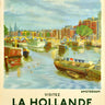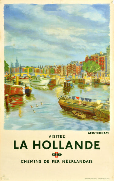 Original vintage train travel poster - Visitez La Hollande Chemins de Fer Neerlandais / Visit Holland Dutch Railways - featuring great artwork by Arthur Goldsteen (1908-1985), depicting a peaceful scenic view of boats on a canal with ducks swimming on the calm reflective water and a young girl running after a dog on a barge in the foreground, two horses on the embankment by moored boats on the side and trees and colourful buildings along the river Amstel with the Magere Brug / Skinny Bridge connecting the central Kerkstraat street, the historic 1614 Zuidertoren South Church Tower visible in the distance below the lightly cloudy blue sky, the bold title text and logo on the border below. Founded in 1938, the Dutch state owned Nederlandse Spoorwegen is the main passenger railway operator in the Netherlands. Printed by Senefelder, Amsterdam. Good condition, creasing, tears, minor staining, paper loss in top right corner.
