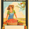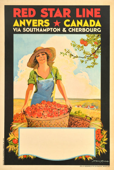 Original vintage cruise travel advertising poster - Red Star Line Anvers Canada via Southampton & Cherbourg - featuring a bright and colourful image of a lady wearing blue dungarees over a green shirt and a straw hat, holding a large basket full of red apples and looking at the viewer, a basket of green apples and wheat in the foreground with fields and a farm in the background, the bold title in red and yellow lettering on the border above. Founded in 1871, the Red Star Line provided transatlantic shipping and transportation services until the company was taken over by Holland America Line in 1935 after being declared bankrupt. Printed by J.E. Goossens, Ste Ame, Brussels. Very good condition, repaired tears, minor creasing, minor staining, backed on linen.