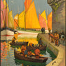 Original vintage travel poster for Concarneau Finistere in Brittany / Bretagne featuring scenic artwork by Charles-Jean Hallo (1882-1969) of the bustling historic fishing port showing fishermen bring in their catches of fish on small wooden boats to men on the harbour wall and colourful sails of traditional fishing boats moored on the calm reflective water with seagulls flying above, the bold title text with a small map of France marking the locations of Paris and Concarneau below. The 15th-16th century fortified walled city of Concarneau / Ville Close was a former sardine and tuna fishing town, now a popular tourist destination. Printed by Lucien Serre & Cie., Paris. Good condition, restored tears, restored paper losses, creasing, backed on linen.