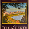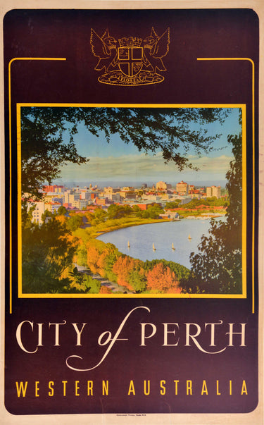 Original vintage travel poster for the City of Perth Western Australia featuring a scenic view, most likely from King's Park overlooking Swan River with sailing boats on the water lined by trees leading to the city buildings below the lightly cloudy blue sky, the overhanging tree branches in the foreground framing the image set in a yellow line border, the official City of Perth coat of arms with its motto Floreat / Let it Flourish in yellow above and title in stylised white and yellow lettering on the dark background below. Printed by the Government Printer, Perth. Good condition, restored tears, staining, backed on linen.
