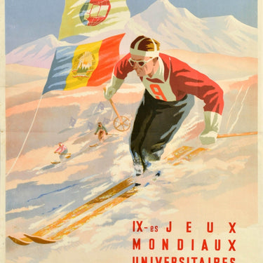 Original vintage sport poster for the International Student Union IX World University Winter Games held from 28 January - 4 February 1951 in Poiana Romania featuring dynamic artwork depicting a skier wearing a number 9 racing bid skiing down the piste at speed with two skiers and mountains in the background, flags flying on the side and the bold title text in red letters above and below in French - Union Internationale des Etudiants IXes Jeux Mondiaux Universitaires d'Hiver Republique Populaire Roumaine. Good condition, folds, creasing, staining.