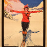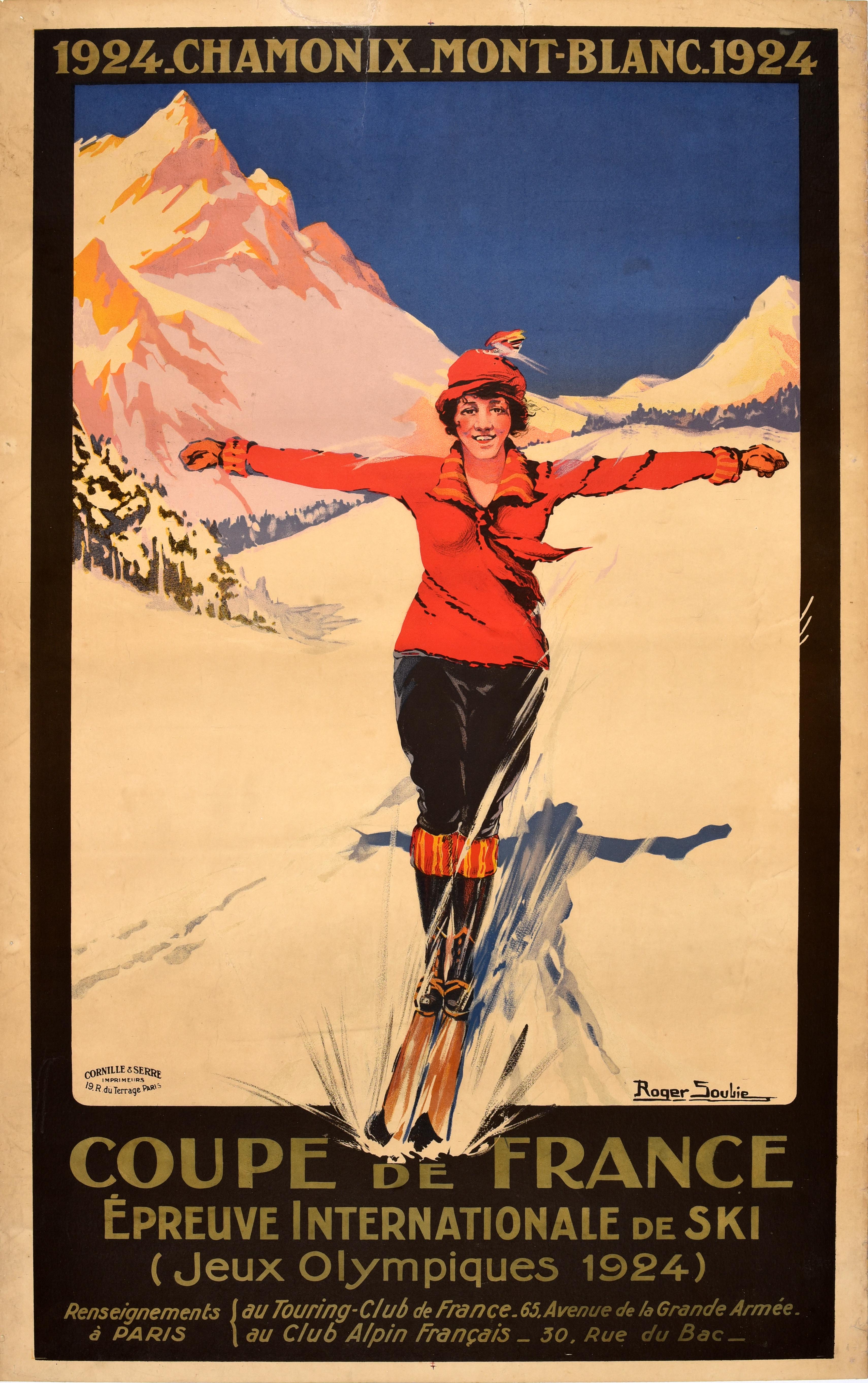 Rare original antique skiing and winter sports poster - Chamonix Mont Blanc Coupe de France Epreuve Internationale de Ski (Jeux Olympiques 1924) / French Cup International Ski Competition (Olympic Games 1924) - featuring great artwork by the French artist Roger Soubie (1898-1984) depicting a stylishly dressed skier in a red top and hat, holding out her arms and smiling to the viewer while skiing down a slope with snow spraying up from her skis in the foreground, a dramatic mountain view of trees and the Mont Blanc massif against the deep blue sky in the background, the text in bold lettering on the margin above and below with the information - Rensiegnments a Paris au Touring-Club de France 65 Avenue de la Grande Armee au Club Alpin Francais 30 Rue du Bac. The popular alpine ski resort valley of Chamonix is located in the French Alps; Mont Blanc is the highest mountain in Europe. The historic International Winter Sports Week / Semaine Internationale des Sports d'Hiver was designated by the International Olympic Committee IOC as the first ever Winter Olympics, held from 25 January to 5 February 1924; the events included speed skating and figure skating, ice hockey, bobsleigh and curling, ski jumping, Nordic and cross country skiing. Printed by Cornille & Serre, Paris. Good condition, restored tears, staining, backed on linen.