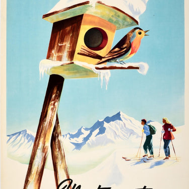 Original vintage skiing poster advertising Winter Sports in France / Wintersport in Frankreich featuring a great design depicting a couple on skis enjoying the view of the snowy mountains below the blue sky background, a robin redbreast bird on a snow-topped wooden birdhouse in the foreground. Printed by E. Desfosses Paris. Good condition, small restored paper losses in edges, small restored tears on edges, minor staining, backed on linen.