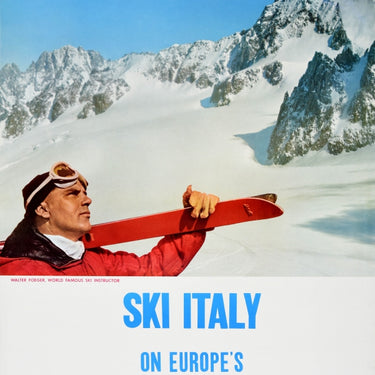 Original vintage skiing travel poster - Ski Italy on Europe's Most Exciting Mountains Alitalia Airlines - featuring a skier with goggles on his head and holding a pair of red skis over his shoulder, looking up at the snowy mountain peaks below a blue sky, the photo captioned - Walter Foeger World Famous Ski Instructor. The champion alpine ski racer from Austria Walter Foeger (1917-2007) developed the Natur Teknik parallel skiing teaching method worldwide and transformed the Jay Peak mountain in Vermont into a major ski area: he was elected to the US National Ski Hall of Fame in 2005. Very good condition, minor creasing, minor staining, backed on linen.