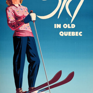 Original vintage winter sport poster - Ski in Old Quebec Chateau Frontenac - featuring stunning artwork depicting a smiling lady with blonde hair wearing a patterned pink jumper with small images of snow covered chalets and trees, mountains and skiers on it, standing on top of a snowy slope holding a ski pole and looking up to the blue sky in the background, the title in stylised white lettering above and in black below. The historic Chateau Frontenac hotel opened in 1893 in Old Quebec Canada (now the luxury hotel Fairmont Le Chateau Frontenac); this iconic building is located in the old walled city by the St Lawrence River near the Stoneham Le Massif and Mont Saint Anne mountains. Good condition, restored tears, minor staining, minor creasing, backed on linen.
