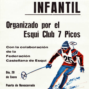 Original vintage winter sports poster for a skiing competition - I Trofeo Infantil - 1st Youth Trophy organised by the Esqui Club 7 Picos / 7 Peaks Ski Club in collaboration with the Castellana Ski Federation held on 20 January at Puerto de Navacerrada ski resort featuring an illustration of a skier wearing blue and red and a number 25 sport bib skiing at speed with snow spraying up against the light background, the bold black text on the side and a Drink Coca Cola logo above. Good condition, folds, creasing, small tear, minor stain.
