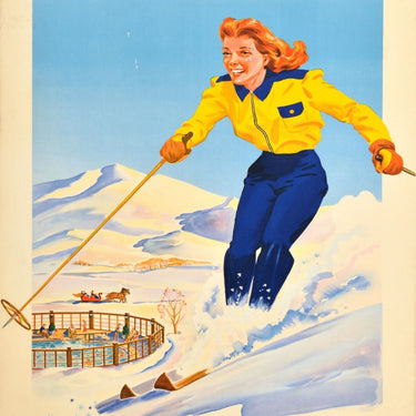 Original vintage winter sports travel poster - This Winter Sun Valley - featuring a great image of a smiling lady in a yellow and blue ski suit skiing down a snowy slope at speed with people enjoying swimming in an outdoor heated pool and riding a horse drawn sleigh / sledge in front of trees and the Bald Mountain below the blue sky in the background, the bold blue text above and below with a snowflake design on the side. Founded in 1936 the popular Sun Valley ski resort is located in Idaho USA. At 2,790m the Bald Mountain is one of the highest mountains in the Smoky Mountains range. Good condition, repaired tears, staining, restored paper skimming, backed on linen.