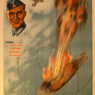 Original vintage propaganda movie poster for a film, Deep Raid (глубокий рейд). The caption on the poster reads "Brief: gain altitude and destroy the zeppelin of the enemy." Good condition, top and bottom margins trimmed, small loss on top right margin. The airship pictured is most likely an LZ 130 Graf Zeppelin II that was built after the Hindenburg disaster. It was used by the Luftwaffe, Nazi Air Force, to conduct air reconnaissance over Poland and Great Britain. Given that in 1939 USSR signed non-aggression pact with Germany, most of the copies of this poster were destroyed.