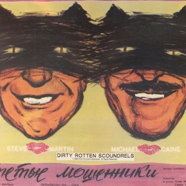 Original vintage Russian film poster for the comedy directed by Frank Oz, Dirty Rotten Scoundrels, starring Steve Martin, Michael Caine and Glenne Headly. Fun image of the two con men smiling, the tops of their faces scribbled over to feature cats eyes and ears, with lipstick kiss marks between their names below. Horizontal. Good condition, faint folds.