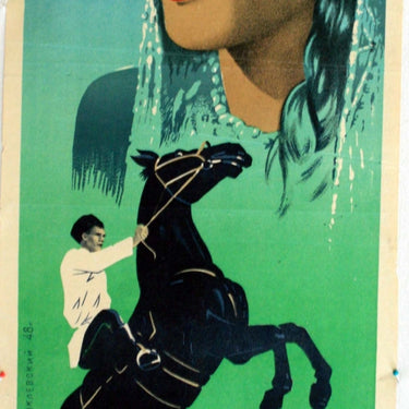 Original vintage movie poster for a comedy film Далекая невеста / Distant Bride (aka Under Sunny Skies) by the renowned Soviet artist and graphic designer, Yakov Ruklevsky (1884-1965). Great image of a lady wearing a traditional headdress with a man riding a rearing horse below against a green background.