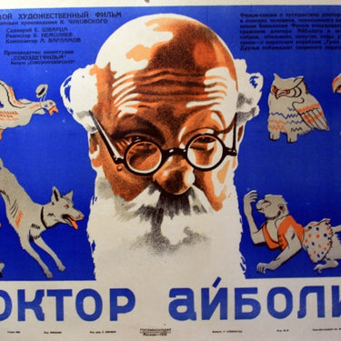 Original vintage movie poster for a Soviet family comedy film, Doctor Ouchithurts (Doktor Aybolit / Доктор Айболит), directed by Vladimir Nemolyayev and starring Maksim Shtraukh, Anna Semionovna Vilyams and Igor Arkadin. Soyuzdetfilm. Horizontal. Fun image of a vet surrounded by various animals: a monkey, parrot, owl, duck, dog and pig.