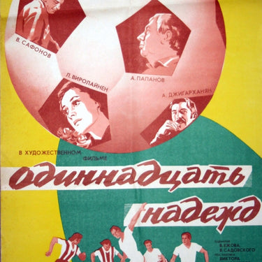 Original vintage Soviet cinema poster for a sport movie - Одиннадцать надежд Eleven Hopes - directed by Viktor Sadovsky and set in Leningrad / St Petersburg about a coach who selects eleven players for an international soccer / football match in the hope of winning the World Championships. Great design of the key players and characters depicted on a football image with the game being played below. Good condition, folded.