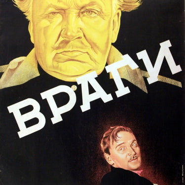 Original vintage 1938 Soviet film poster for a drama movie based on a play by Maxim Gorky - Враги / Enemies - directed by Aleksandr Ivanovsky and starring Valentin Kiselyov, Tamara Glebova and Boris Poslavsky. Dynamic design featuring two men on a dark background with the title text running across the centre. Backed on Japanese paper.