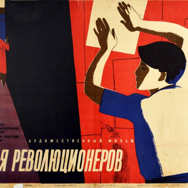 Original vintage movie poster for a Chinese drama film A Family of Revolutionaries / Семья Революционеров / Geming Jiating directed by Shui Hua featuring an illustration of a young lady in a long red dress cautiously looking around the corner of a wall in the dark while a man sticks a poster leaflet onto a red wall in the foreground. The story begins during the 1911 Xinhai Revolution and tells the story of a family during the Northern Expedition (1926-1928) and Anti-Japanese War (1937-1945). Horizontal. Fair condition, folds, creasing, tears, staining, paper loss on bottom edge.