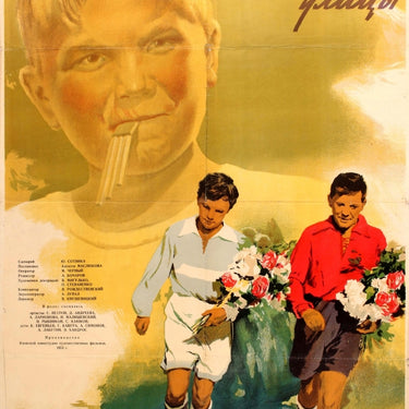Original vintage Soviet film poster for a movie Football Team From Our Street - Команда с нашей улицы - featuring a great illustration of two young football players in their sports uniforms carrying bouquets of flowers with a large image of young boy blowing a whistle in the background, the title above in stylised letters with the rest of the text on the side. Good condition, folded as issued, small marks, small tears, pinholes and creases in margins.