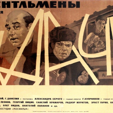 Original vintage classic Soviet comedy movie, Gentlemen of Fortune (Джентльмены удачи), featuring images of the main characters behind the stylised title text. The film is about a teacher who looks exactly like a thief and ends up teaching his fellow prisoners whilst in jail. Horizontal. Good condition, folds, pinholes, restored tears and minor loss on top corner.