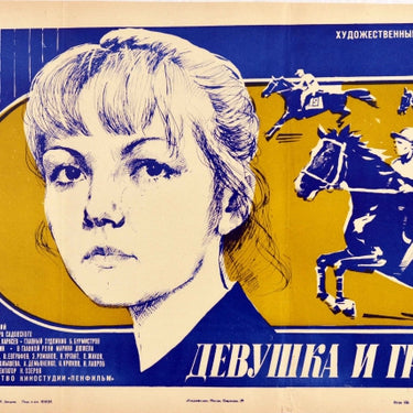 Original vintage Soviet film poster for sport drama movie Девушка и Гранд / Girl and Grand directed by Victor Sadovsky featuring an illustration in white and blue of the main character looking at the viewer with jockeys racing horses on a yellow race track and a man on the side in the background. The plot tells the story of Marina who saves Grand the horse from being put down, helps him recover, and becomes a horse rider. Horizontal. Good condition, folds, tears, creasing.