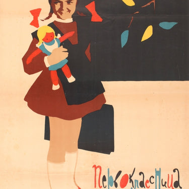 Original vintage cinema poster for the re-release of a 1944 movie - Girl From the First Grade Первоклассница Pervoklassnitsa - featuring a young girl wearing school uniform standing inside a class room holding a doll in front of a blackboard with multi-coloured leaves on a tree branch and colourful stylised title text. Good condition, folded as issued, creases and foxing.