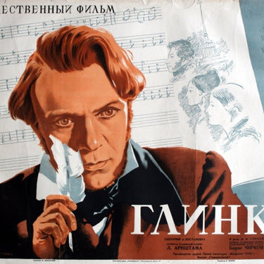 Original vintage Soviet film poster for a feature about the famous Russian composer Glinka. Designed by prominent poster artist B. A. Zelensky in 1946. Film produced by MosFilm Studios in the same year. Horizontal.