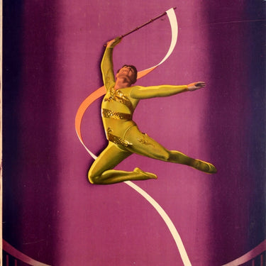 Original vintage Soviet film poster for the movie Grand Concert showcasing the stars of the Bolshoy Ballet in Moscow. Dynamic image of Asaf Messerer leaping up into the air as he performs the famous Ribbon Dance from The Red Poppy ballet with a classical orchestra playing music below. The award-winning ballet dancer, choreographer and instructor, Asaf Messerer (1903-1992), was born in Lithuania and trained at the Bolshoi Ballet School in Moscow from 1919-1921; he went on to become their principal soloist before retiring in 1954, after which he continued teaching at the Bolshoi and abroad. Fair condition, bottom of the poster with film title has been trimmed, folds, stains, minor tears and creases in side margins.