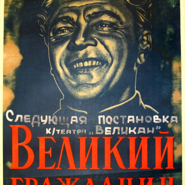 Original Soviet film poster for Великий гражданин / Great Citizen - the second part of the series directed by Fridrikh Ermler and starring Nikolay Bogolyubov, Ivan Bersenev and Oleg Zhakov with music by Dmitri Shostakovich (1906-1975). Great image of a smiling man against a dark background with the title text in red below.