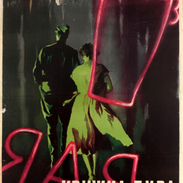 Original vintage cinema poster for the Russian release of a 1955 Hungarian film directed by Felix Mariassy, Egy Pikolo Vilagos (A Half Pint of Beer / кружка пива), starring Eva Ruttkai, Tibor Bitskey, Elma Bulla, Maria Sulyok and Janos Gorbe. Great image of a man and lady, the light reflecting off her dress, walking at night away from the viewer inside a bar with an advertising light sign in the window featuring a glass of beer and letters visible in the foreground, the title text in stylised letters below and credit text above. Fair condition, folded as issued, paper losses, pinholes, creases and tears in margins.