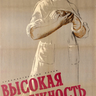 Original vintage Soviet film poster for Высокая должность / High Rank / High Position filmed at the Tajik film studio and directed by Boris Kimyagarov (Bension Kimyagarov; 1920-1979), starring Dilbar Kasymova in the lead role as Zulfia - a medical assistant at a surgical clinic who rejects an offer of a promotion to start up her own doctor's practice in the Tajikistan mountains - featuring a fantastic sketch illustration of the doctor in surgery uniform wearing a medical face mask and long gloves with the stylised title text in bold red letters diagonally below. Very good condition, folds, small paper losses.
