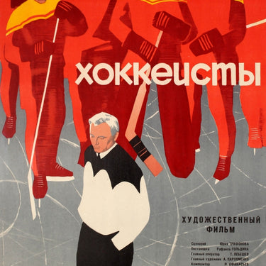 Original vintage Soviet movie poster for the 1965 sport drama Хоккеисты / The Hockey Players directed by Rafail Goldin and starring Vyacheslav Shalevich, Elza Lezhdey, Gennadiy Yukhtin, Nikolay Rybnikov, Vladimir Ivashov, Aleksandr Kuznetsov and Aleksandr Orlov. Colourful design showing the hockey team coach standing in the foreground with the ice hockey players wearing red and orange kit with helmets and holding their hockey sticks on the lined ice in the background, the title in stylised white letters and the credit text below. Good condition, creases and small tears in margins.