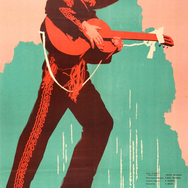 Original vintage Soviet film poster for an American musical romance film Sombrero adapted from the book Mexican Village by Josefina Niggli. Greatimage of a young Mexican boy wearing traditional clothes and a sombrero hat playing the guitar with the text below. Very good condition, folded as issued, faint creases, pinholes in corners.