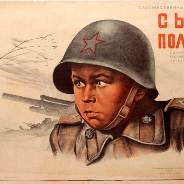 Original vintage Soviet war propaganda movie poster Сын Полка (Syn polka) - Son of the Regiment directed by Vasili Pronin and based on the novel by Valentin Kataev about an orphaned Russian boy Vanya Solntsev who is adopted by the artillery regiment (a later cinema drama based on the same novel was filmed in 1981). Dramatic image of a young soldier boy wearing a uniform with a red star on his helmet crouched down at a battle front with a strong wind blowing a tree in front of cannon guns behind him, the text above in red and grey stylised letters. Horizontal. Good condition, small tears and paper loss on margins, folds, staining.