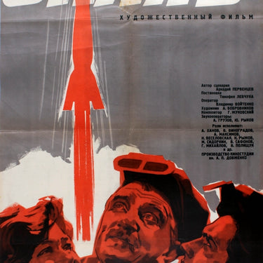 Original vintage Soviet movie poster for a film Space Alloy - Космический Сплав, a near future production fiction story about the creation of a new heavy duty alloy for Soviet spacecrafts. Dynamic design showing two metalworkers and a smiling lady looking up to a red rocket in the sky shooting past the title in stylised white letters. Good condition, folded as issued, creases, cracks and browning in upper half.