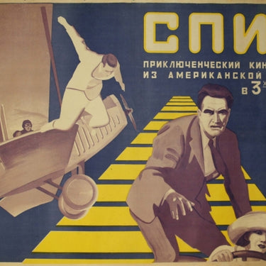 Original vintage movie poster for a Russian film, спид / Speed featuring a dynamic constructivist image of a man jumping from a plane and a lady driving along a yellow lined route with a man behind her and the stylised title text above. Horizontal.