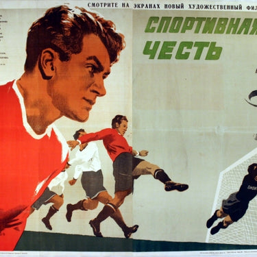 Original vintage movie poster for a Russian film Sporting Honour directed by Vladimir Petrov and starring Aleksei Gribov, Grigori Sergeyev and Margarita Lifanova. Dynamic image of a football match featuring a goalkeeper ('Shorty') diving for the ball. Large size. Horizontal. Good condition, repaired folds and tears, printed on two sheets, backed on linen.