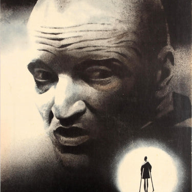 Original vintage Soviet film poster for a science-fiction art film Stalker / Сталкер directed by Andrei Tarkovsky and starring Alexander Kaidanovsky, Anatoli Solonitsyn, Nikolai Grinko and Alisa Freindlich with screenplay written by Boris and Arkady Strugatsky, a sci-fi movie loosely based on the novel Roadside Picnic (1972) featuring dramatic philosophical and psychological themes. Strong design showing a haunting black and white portrait of a man with a shaved head looking round with a spotlight on a small silhouette of a girl walking with crutches below, the title in the bottom left corner in stylised grey letters. Very good condition, minor creases in margins.